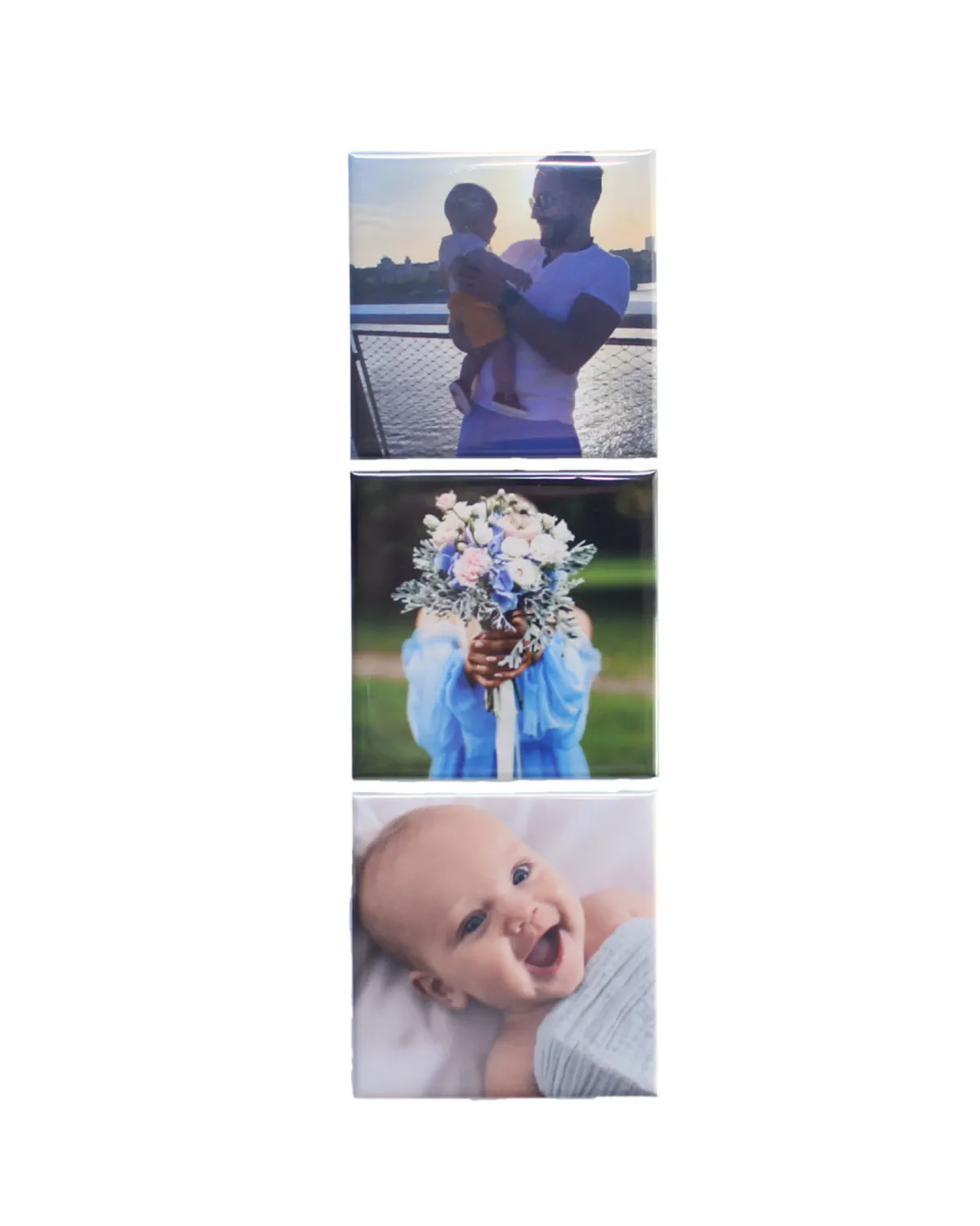 To zestaw 3 personalizowanych magnesów na lodówkę lub tablicę magnetyczną, wykonanych z Twoich zdjęć. Rozmiar każdego z magnesów to 6,5 x 6,5 cm.