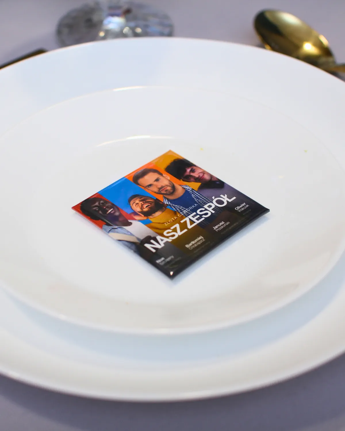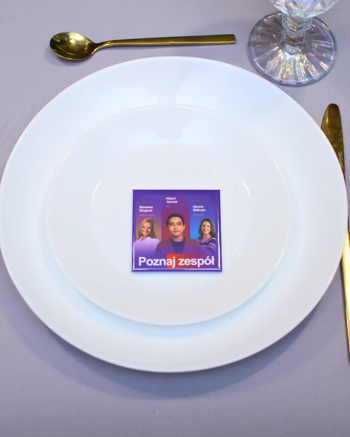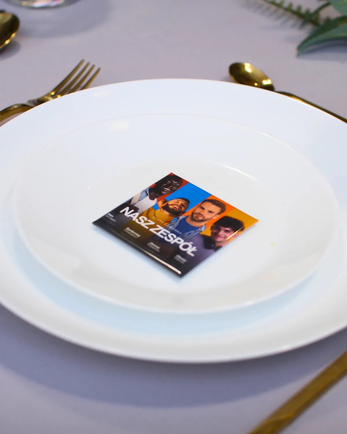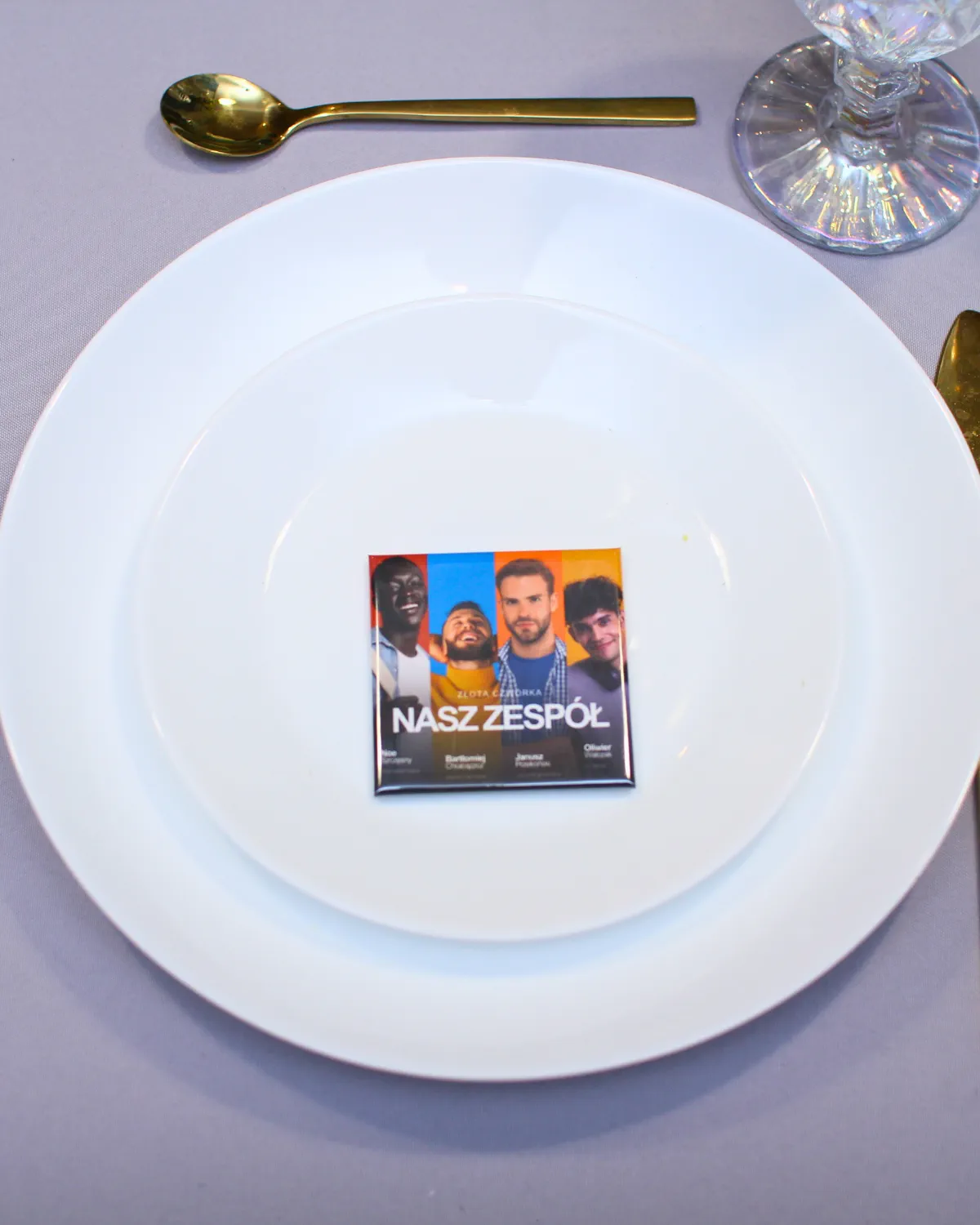 To personalizowany magnes ze zdjęciem (np. zespołu), który wskazuje miejsce przy stole i jednocześnie jest pamiątką dla uczestnika.